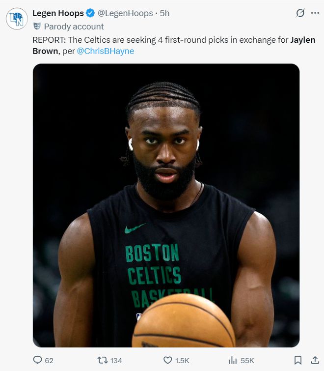 隨后根據(jù)《雅虎體育》記者克里斯-海恩斯的消息,凱爾特人對(duì)杰倫-布朗的報(bào)價(jià)是四個(gè)首輪簽。雖然布朗在本賽季的表現(xiàn)較上賽季有所下滑,但布朗依舊是巔峰期的超級(jí)巨星,去年是FMVP+東決MVP+總冠軍。