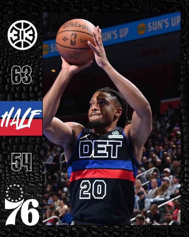 次節(jié)比賽,76人率先一波11-3攻勢反超7分,前5分鐘活塞40-45落后。格林連續(xù)三分開火得分,引領活塞打出一波11-1攻勢反超5分,活塞隨后持續(xù)壓制76人逐步擴大領先優(yōu)勢,活塞單節(jié)35-27凈勝8分,上半場結(jié)束活塞63-54領先76人9分。前兩節(jié)比賽雙方均是兩人得分上雙,活塞三分22中11,鄧羅3記三分13分與格林3記三分15分,76人三分20中7,馬克西13中4得到12分與埃奇庫姆3記三分13分。